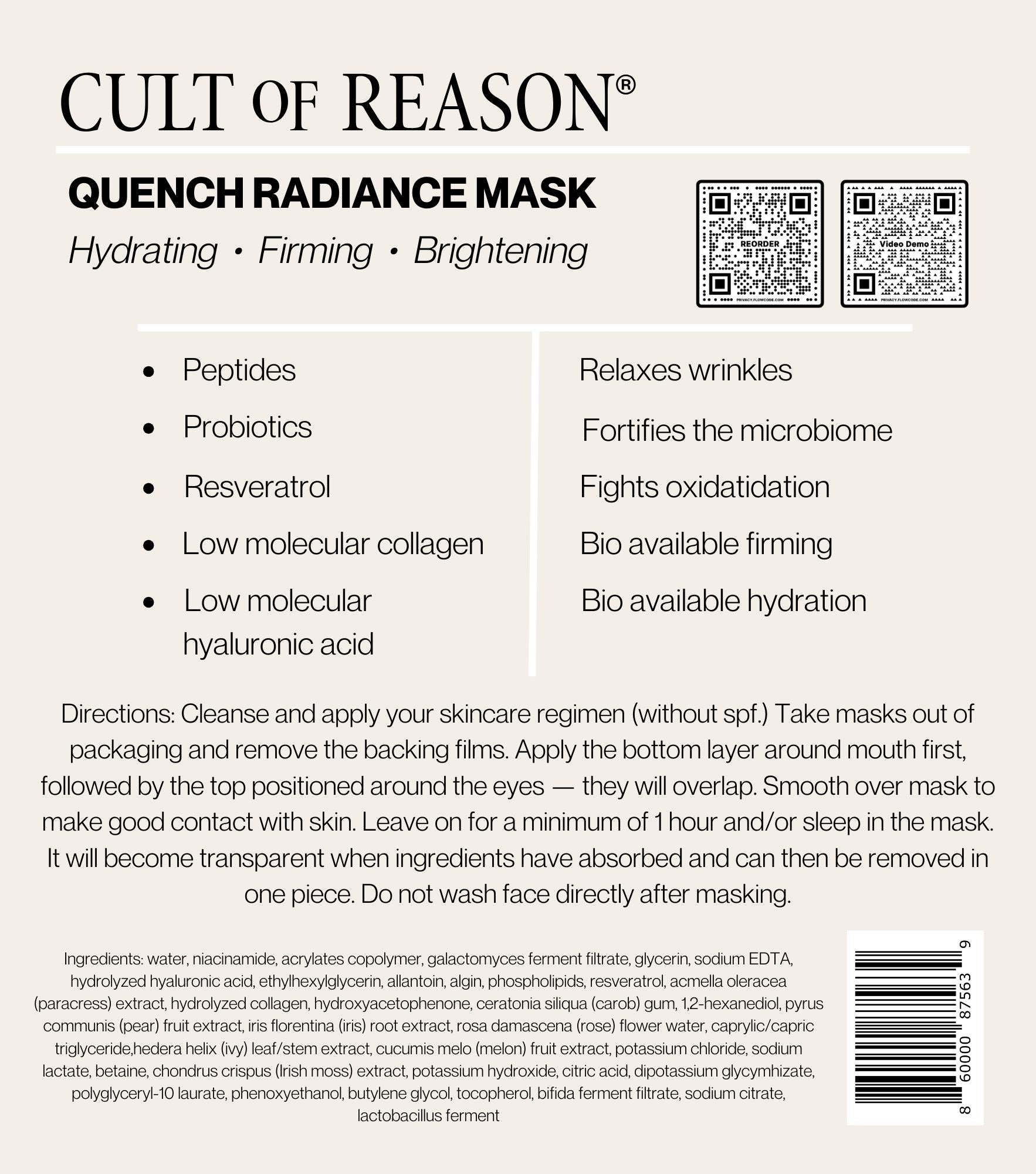 The Quench Radiance Mask locks in moisture and wrinkle relaxing peptides, encouraging your skin to fully absorb its nourishing ingredients, leaving it plump, hydrated, and glassy.