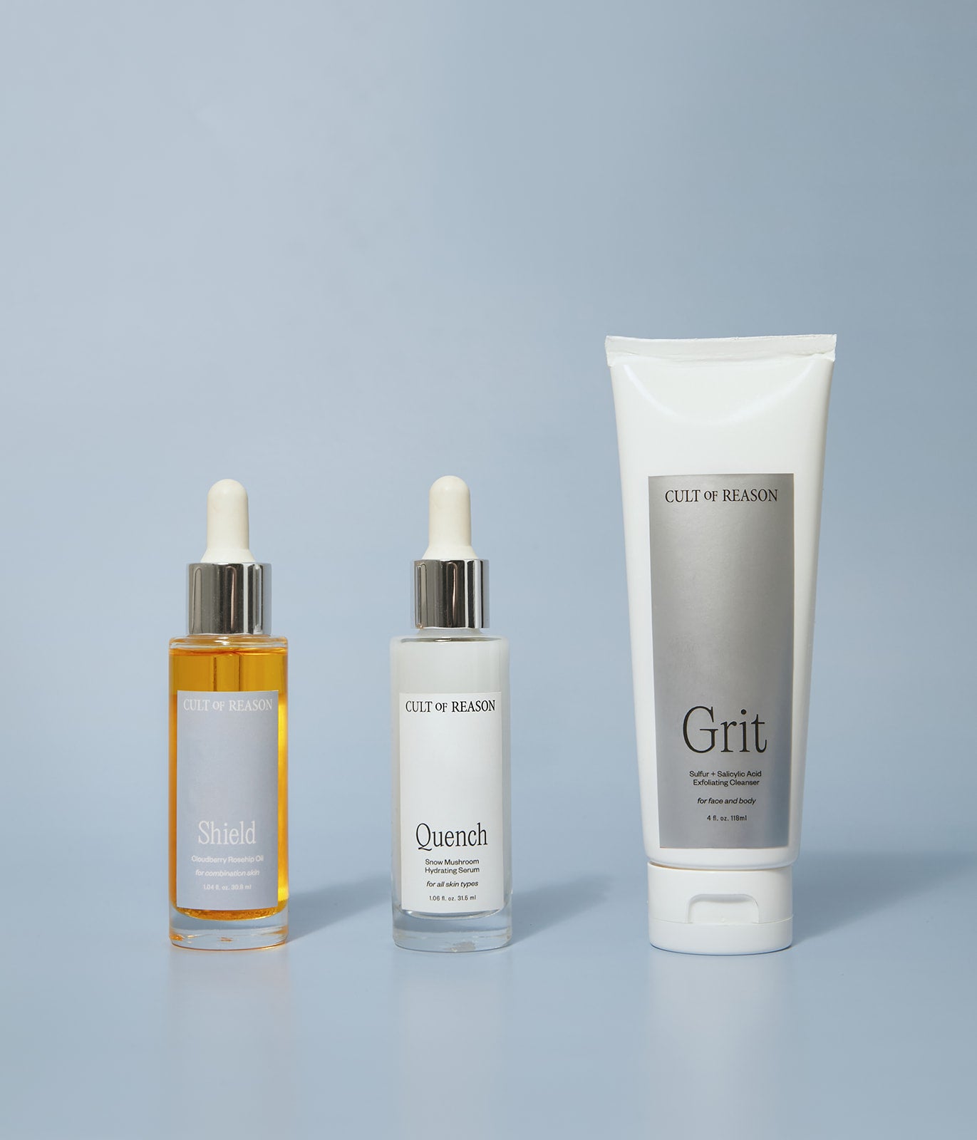 I have been using Cult of Reason products since Grit first appeared on the market. I love this natural 'scrub'. Adding Quench and Shield to my daily routine has changed the texture of my skin. I'm 73 and my skin looks like that of a 30 year old....